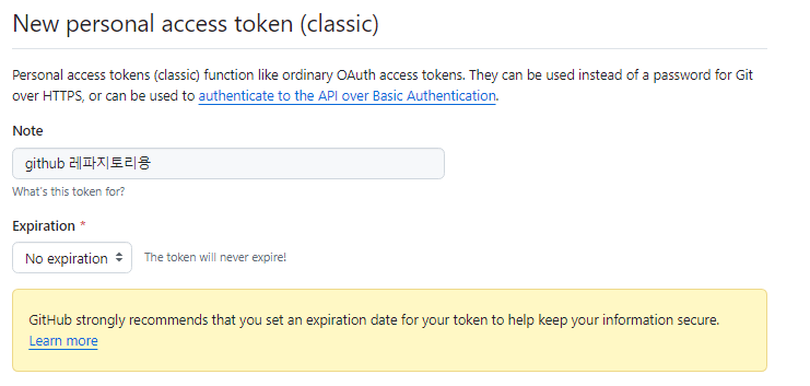 깃허브 토큰 아래 복사해놓고 ******다른곳에 저장해놓기*******