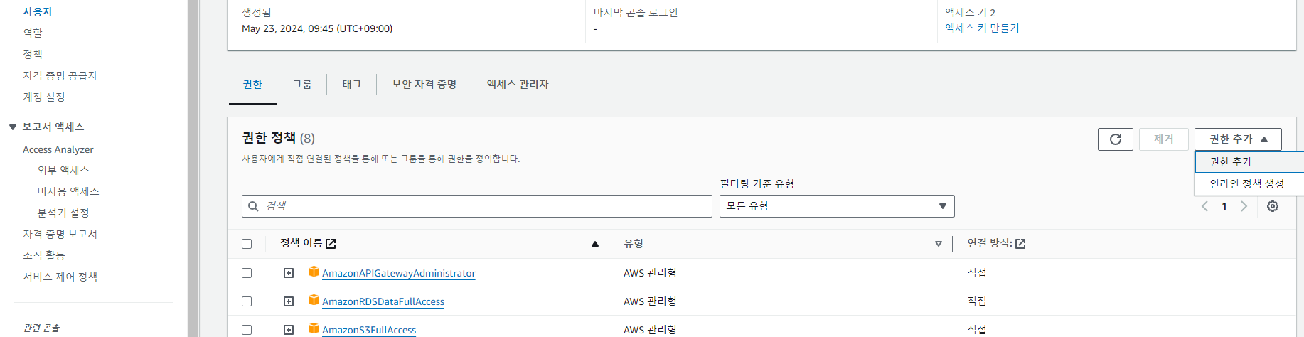 IAM ์ฌ์ฉ์ ์ถ๊ฐ ์ ์ฑ ์๋ 8๊ฐ ์ฒดํฌ ์์ฑํ ์ฌ์ฉ์๋ก ๋ค์ด๊ฐ์ ์ก์ธ์ค ํค(์ธ์ฆ ํค) ๋ง๋ค๊ธฐ ์ฌ์ฉํ๊ธฐ์ ์ ํฉํ ์ก์ธ์ค ํค๋ฅผ ๊ณจ๋ผ์ค๋ค .csv ํ์ผ ๋ฐ์์ฃผ๊ธฐ -> ์๋ฃ ์ฌ