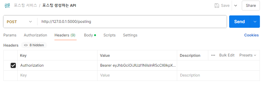 포스트맨의 Headers 부분에, 로그인 한 유저의 accessToken 을 Bearer 뒤에 붙여넣기 하고,
