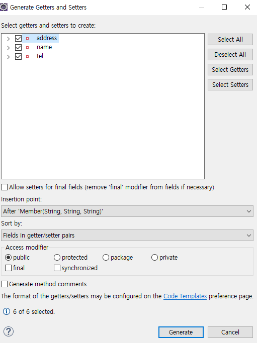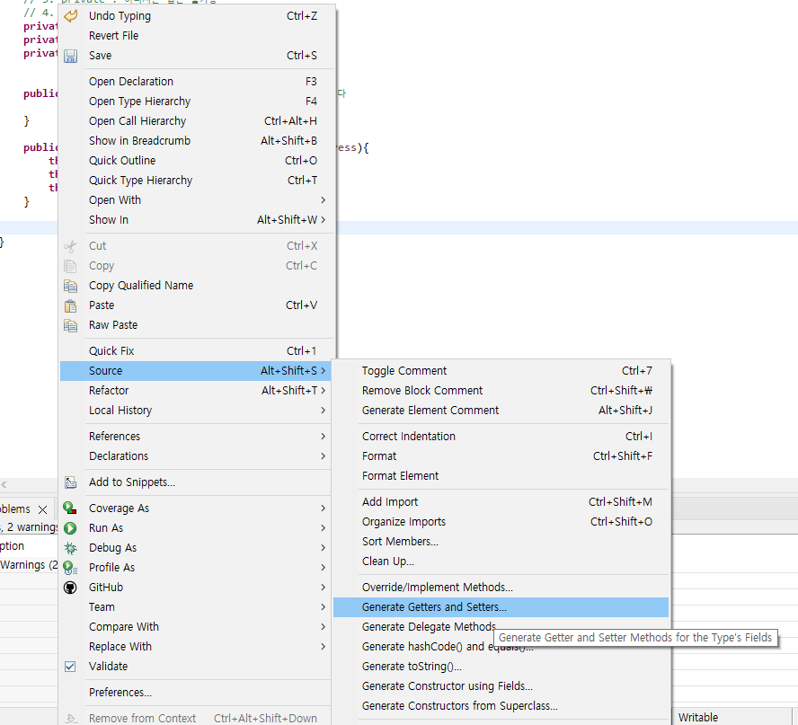 ํ๋ฉด์ ์ฐํด๋ฆญํ์ฌ source -> Generate Getters and Setters