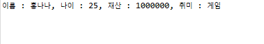 System.out.println("์ด๋ฆ : "+name+", ๋์ด : "+age+", ์ฌ์ฐ : "+money+", ์ทจ๋ฏธ : "+hobby);