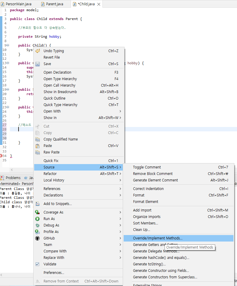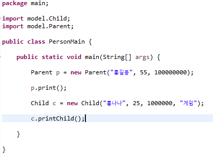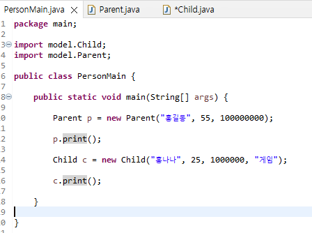 ๊ธฐ์กด์ ์๋ printChild ํจ์ ๋ถ๋ถ์ ์ง์ฐ๊ณ , ๋ถ๋ชจ์ childํจ์๋ฅผ ์ค๋ฒ๋ผ์ด๋ฉ ํ ๊ฒ์ด๋ค.