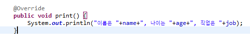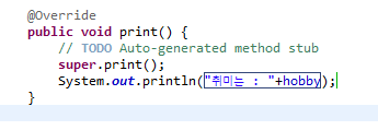 ๋ถ๋ชจ์ print๋ฅผ ์์๋ฐ์ ํ, ๋ํ์ฌ hobby ๋ถ๋ถ์ ์ฐ๋ฉด ๋ฉ์๋ ์ค๋ฒ๋ผ์ด๋ฉํ ์ ์๋ค.