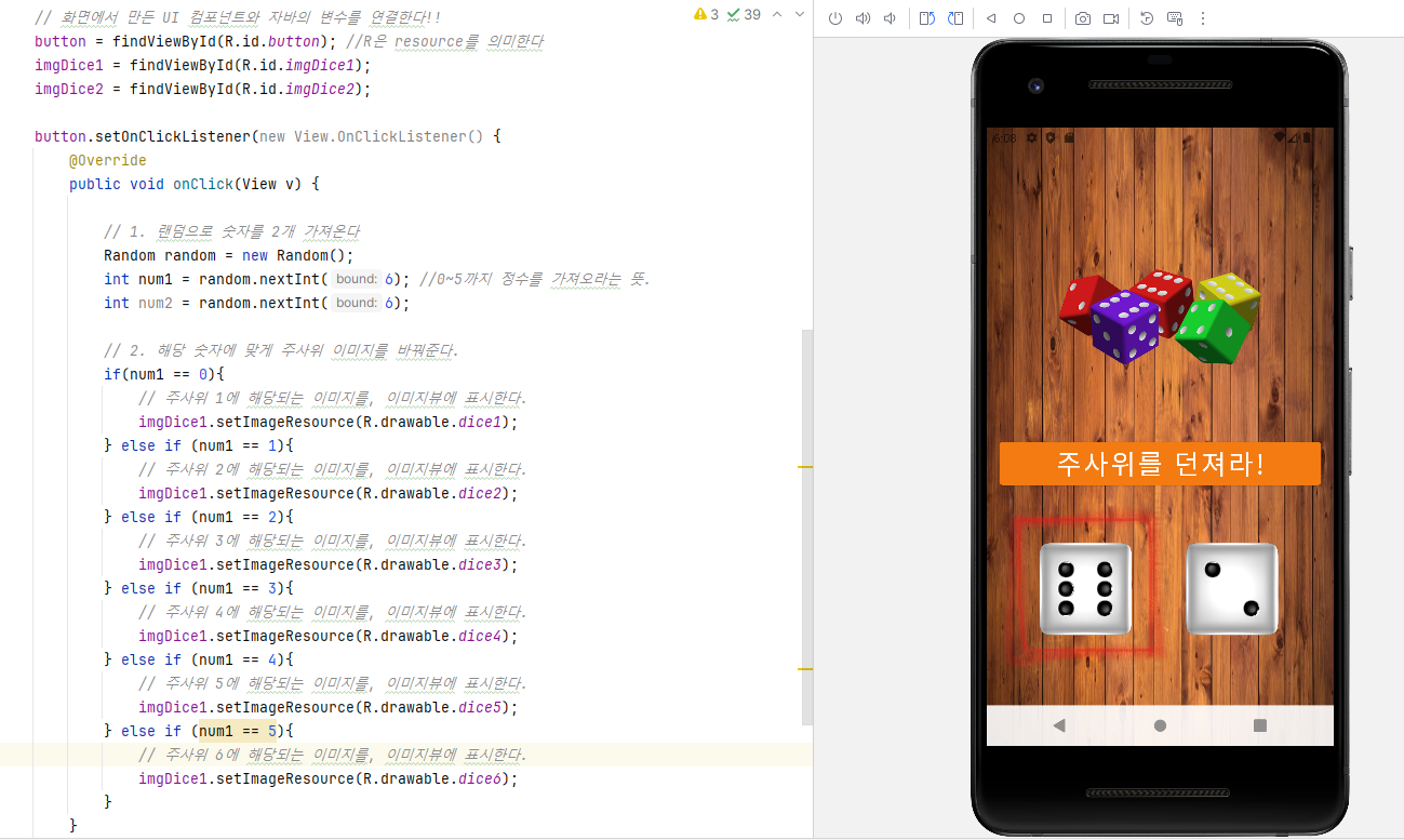 ํ๋ฉด์์ ๋ง๋ UI ์ปดํฌ๋ํธ์ ์๋ฐ์ ๋ณ์๋ฅผ ์ฐ๊ฒฐํ๋ค.