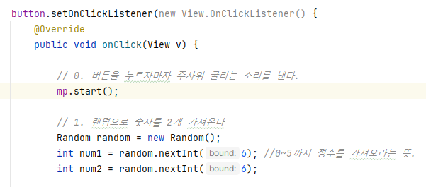 button.setOnClickListener ์์, setOnClickListener ํจ์๋ ์๋๋ก์ด๋์์ ๋ฒํผ ํด๋ฆญ ์ด๋ฒคํธ๋ฅผ ์ฒ๋ฆฌํ๊ธฐ ์ํด ์ฌ์ฉ๋๋ ๋ฉ์๋์ด๋ค. ์ด ํจ์๋ ๋ฒํผ์ด ํด๋ฆญ๋ ๋ ์คํ๋ ์ฝ๋๋ฅผ ์ ์ํ ์ ์๊ฒ ํด์ค๋ค.