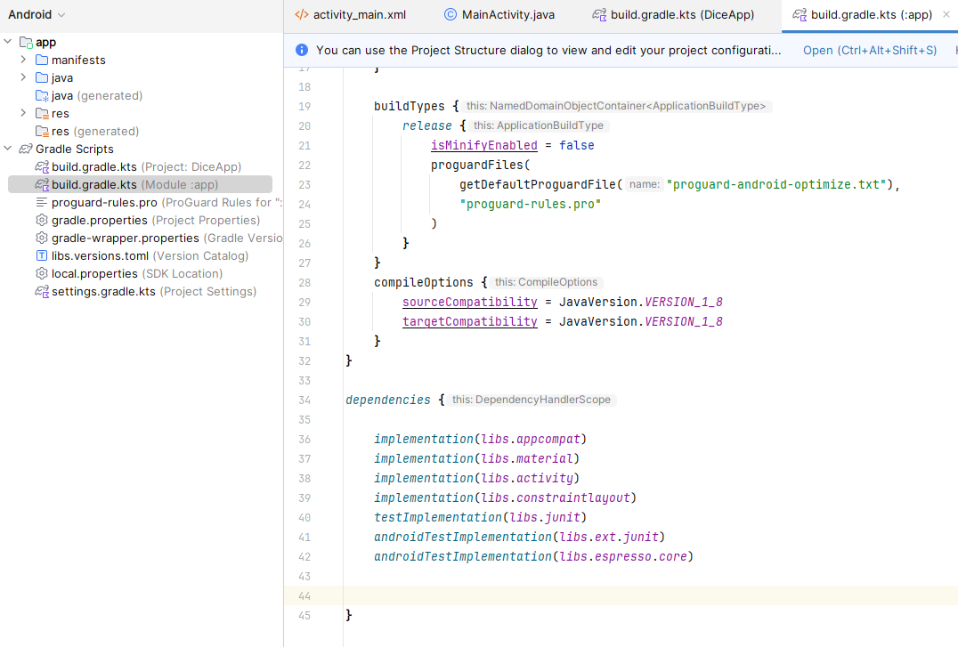 Gradle Scripts -> build.gradle.kts (Module :app) ์ผ๋ก ์ด๋ํ๊ธฐ