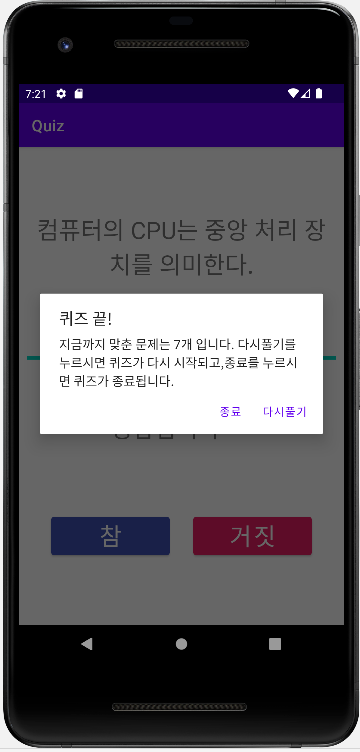 ์ฆ, 10๊ฐ์ ๋ฌธ์ ๋ฅผ ๋ค ํ์์ ๋, ์๋์ ๊ฐ์ด showAlertDialog() ๋ก ํธ์ถํ์ฌ ์๋ ํ์ ์ด ๋จ๊ฒ ์ค์ ํ์๋ค.