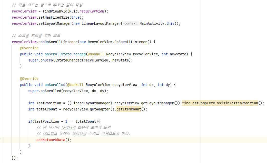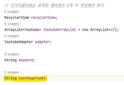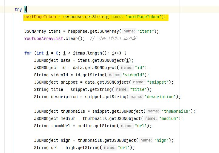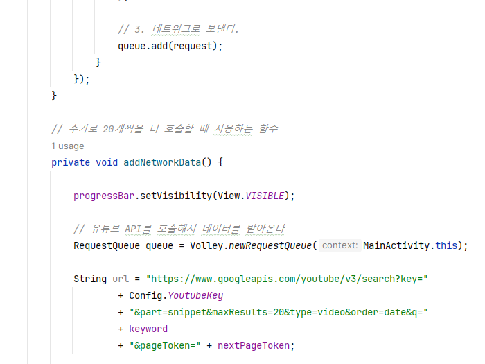 3. MainActivity์์ nextPageToken ํ์ฑ ๋ถ๋ถ์ ์ถ๊ฐํด์ค๋ค.