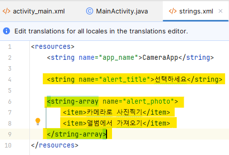 resource -> strings.xml ์์ ์์ฑํด์ค๋ค. (alert-Dialog๋ ํ์ ์ฐฝ์ด๋ค.)