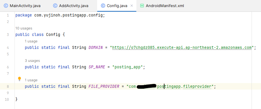 import com.~.postingapp.config.Config;