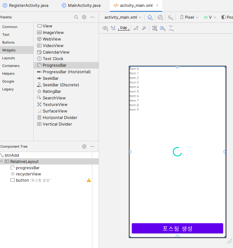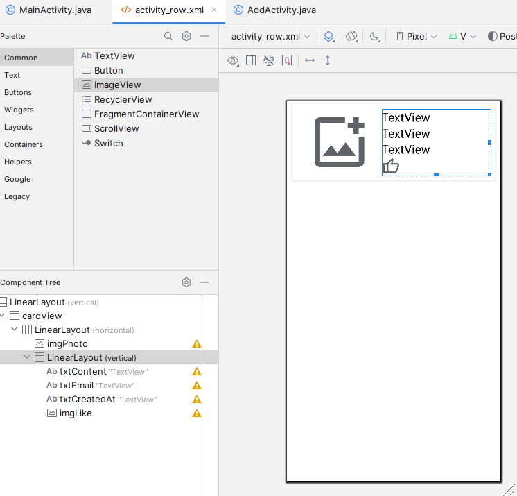 - activity_row์ MainActivity์ ํ๋ฉด์ ์ฐ๊ฒฐํด์ค๋ค.