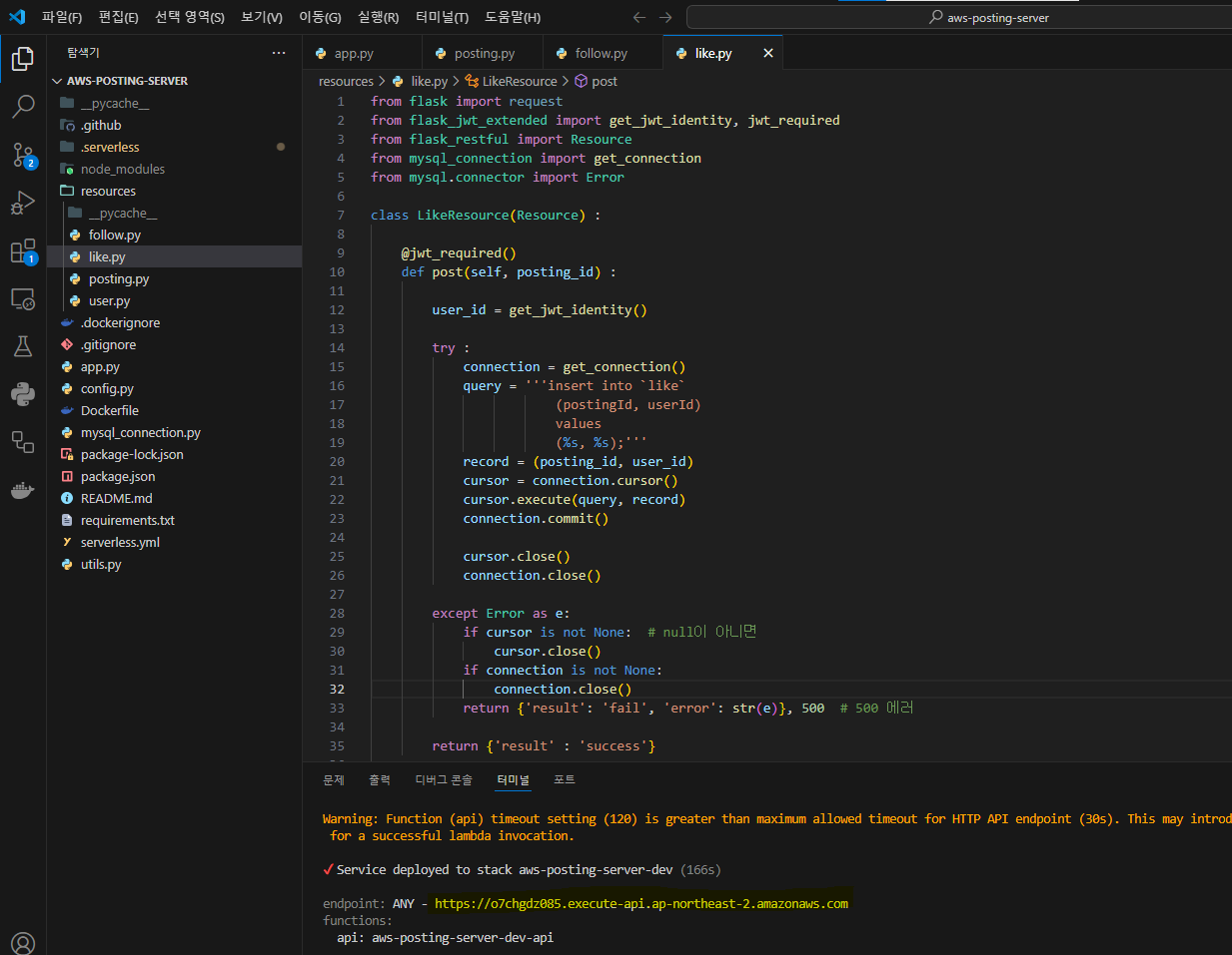 API ๋ง๋ค๊ธฐ ์ ์, ๊ธฐ๋ณธ ์ ํ ํ๊ธฐ (1). serverless๋ก aws-posting-server๋ฅผ ๋ง๋ค๊ณ vscode๋ก ์ด์ด์ฃผ์๋ค. https://codebunny99.tistory.com/105 RestFul API๋ฅผ Serverless Framework๋ก ์ฐ๊ฒฐํ๊ธฐ*** ์๋์ฝ๋ค ํ๋กฌํํธ์์ ๊ฐ์
