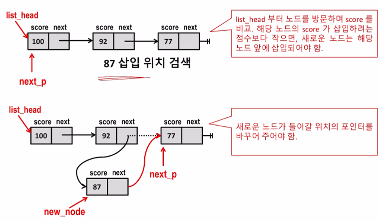 - next_p๋ผ๋ ํฌ์ธํฐ๋ก, ์๋ก์ด ๋ ธ๋๊ฐ ๋ค์ด๊ฐ ์์น(์ ๋ ฌ๋ ์ ์๋ ์์น)๋ฅผ ์ฐพ์์ค