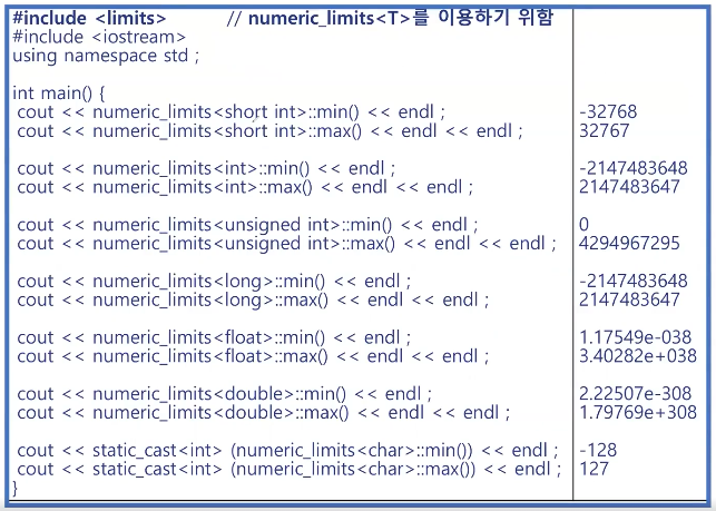 cout << numeric_limits<int>::max() << " is the maximum int\n"; νΉμ minμΌλ‘λ κ°λ₯