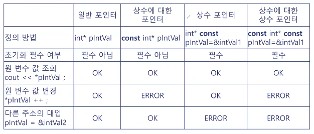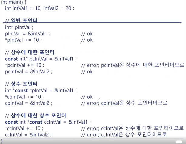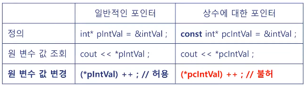 - ์์ ํฌ์ธํฐ๋ ํฌ์ธํฐ๊ฐ ๊ฐ๋ฆฌํค๋ ๋ฐ์ดํฐ๊ฐ ์์๋ก ์ทจ๊ธ๋์ด ํด๋น ๋ฐ์ดํฐ๋ฅผ ๋ณ๊ฒฝํ ์ ์๋๋ก ํ๋ ํฌ์ธํฐ