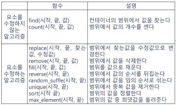 - ์๊ณ ๋ฆฌ์ฆ : ์๊ณ ๋ฆฌ์ฆ์ ์ปจํ ์ด๋์์ ์๋ํ๋ ํจ์๋ค๋ก, ๋ฐ์ดํฐ๋ฅผ ๊ฒ์, ์ ๋ ฌ, ์์ , ๋ณํํ๋ ๋ฐ ์ฌ์ฉ๋จ