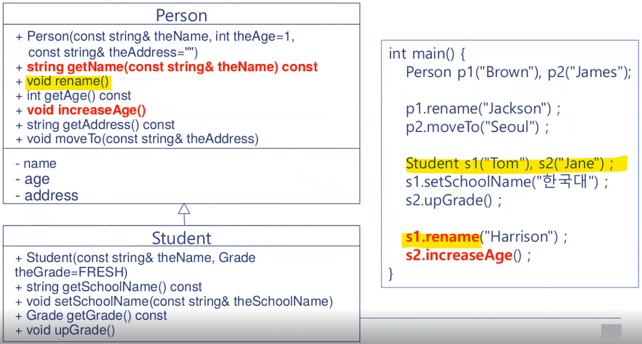 Personμ΄ base class μ΄κ³ , studentκ° derived classμ΄λ€. μμμμ κ°μ΄ νμνλ©΄ μμμ λ°λλ€λ κ²μ μλ―Ένλ€.