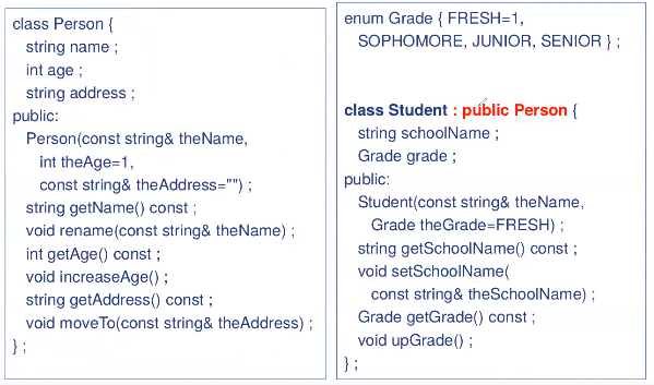 Is-A κ΄κ³: Public μμμ "Is-A" κ΄κ³λ₯Ό λνλΌ μ μλ€. μ¦, Student ν΄λμ€λ Person ν΄λμ€μ μΌμ’ μ΄λΌκ³ λ§ν μ μλ€ μλ₯Ό λ€μ΄, Student κ°μ²΄λ Person κ°μ²΄λ‘ μ·¨κΈλ μ μλ€. (νμν΄λμ€λ κΈ°λ³Έν΄λμ€μ μλΈνμ μ΄λ©° Student ν΄λμ€λ Person ν΄λμ€κ° μ¬μ©λλ μ΄λ κ³³μμλ μ¬μ©λ μ μλ€.) But, (Studentλ₯Ό PersonμΌλ‘ λ€λ£¨λ©΄ νλ‘κ·Έλ¨μ μ»΄νμΌ λκ³ μ€νλμ§λ§, Student ν΄λμ€μλ§ μλ μΆκ°μ μΈ λ©€λ²λ μ¬μ©ν μ μλ€. μ΄κ²μ λ€νμ±(polymorphism)μ νΉμ§ μ€ νλλ‘, μμ ν΄λμ€(κΈ°λ³Έ ν΄λμ€)λ‘ λ€λ£° λλ μμ ν΄λμ€μ μ μλ λ©€λ²λ§ μ κ·Όν μ μλ€λ κ²μ μλ―Ένλ€)