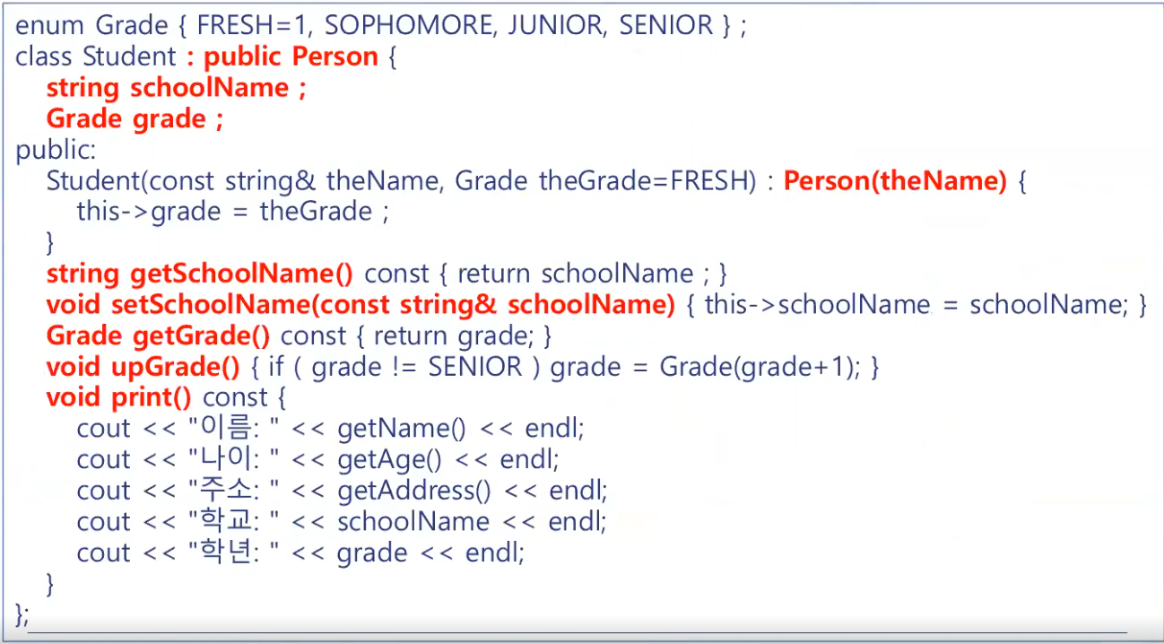 μμν΄λμ€λ λΆλͺ¨ν΄λμ€λ₯Ό publicμΌλ‘ μμ (ex 맨 첫 μμ μμμ class Student : public Person)