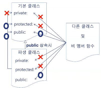 - λΆλͺ¨ ν΄λμ€μ public λ©€λ²λ μμ ν΄λμ€μμ protectedλ‘ λ³νλλ€. μΈλΆμμ μ κ·Όν μ μκ³ , μμ ν΄λμ€ λ° κ·Έ νμ ν΄λμ€μμ μ κ·Ό κ°λ₯νλ€.