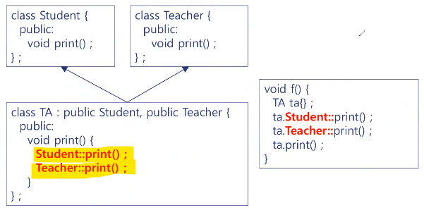 λ ν΄λμ€ λͺ¨λ κ°μ print() ν¨μκ° μλ€λ©΄, λΆλͺ¨ ν΄λμ€ μ€ μ΄λ μͺ½μ ν¨μλ₯Ό μΈ κ²μΈμ§ μ νν νννμ¬μΌ μλ¬κ° λμ§ μλλ€. μλ¬κ° λμ§ μκΈ° μν΄μ Student::print();, Teacher::print(); μ²λΌ λͺ μν΄μ£Όμ΄μΌ νλ€.