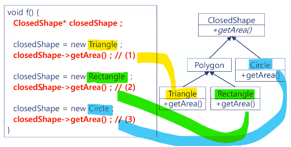 - λ€νμ±μ νμ©: λ€μν ννμ κ°μ²΄κ° μμ λ, λμΌν λ°©μμΌλ‘ λ€λ£° μ μλ€. μλ₯Ό λ€μ΄, λν ν΄λμ€μ λ°°μ΄μμ κ°κ°μ λν λ©΄μ μ κ³μ°ν λ, λνμ νμ μ λ°λΌ μ μ ν getArea() ν¨μκ° νΈμΆλλ€.