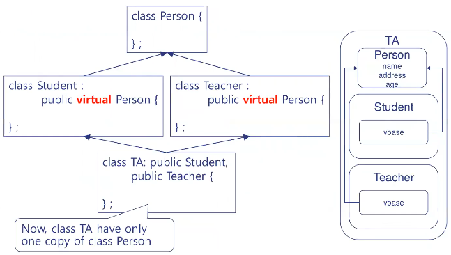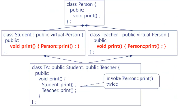ν΄κ²° λ°©λ²: κ°μ μμμ μ¬μ©νμ¬ Person ν΄λμ€λ₯Ό κ°μ κΈ°λ³Έ ν΄λμ€λ‘ λ§λ€λ©΄, TA ν΄λμ€μλ Person ν΄λμ€μ λ¨μΌ μΈμ€ν΄μ€λ§ μ‘΄μ¬νκ² λμ΄ Person::print()κ° λ λ² νΈμΆλλ λ¬Έμ κ° ν΄κ²°λλ€.