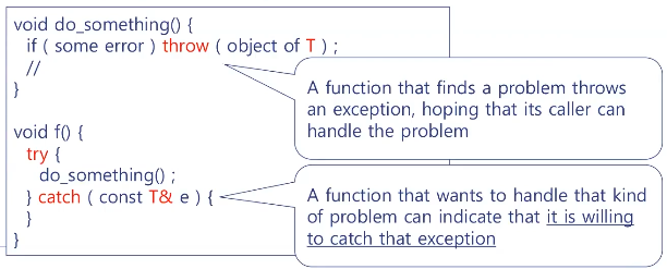 C++์์๋ throw, try, catch๋ฅผ ํตํด ์์ธ ์ฒ๋ฆฌ๋ฅผ ํ ์ ์๋ค.
