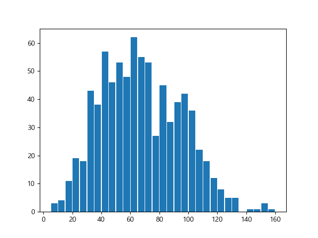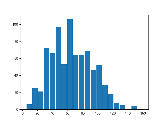 # rwidth๋ ๋ง๋์ ๋๋น๋ฅผ ๋ปํ๋ฉฐ, 0.9๋ก ์ค์ ํ๋ฉด ๋ง๋์ ํญ์ด ์ ์ฒด ๊ฐ๋กํญ์ 90%๋ฅผ ์ฐจ์งํ๊ฒ ๋๋ค
