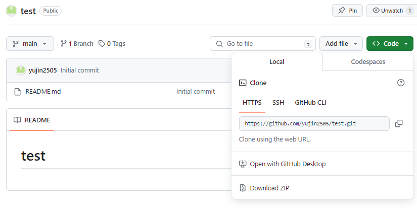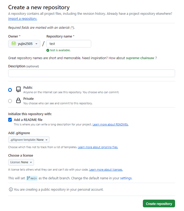 ์ ๋ชฉ์ test์ผ๋ก ํ์๊ณ public(๊ณต๊ฐ), Readme file์ ์๋์ผ๋ก ๋ฃ๋๋ก ์ค์ ํ์๋ค