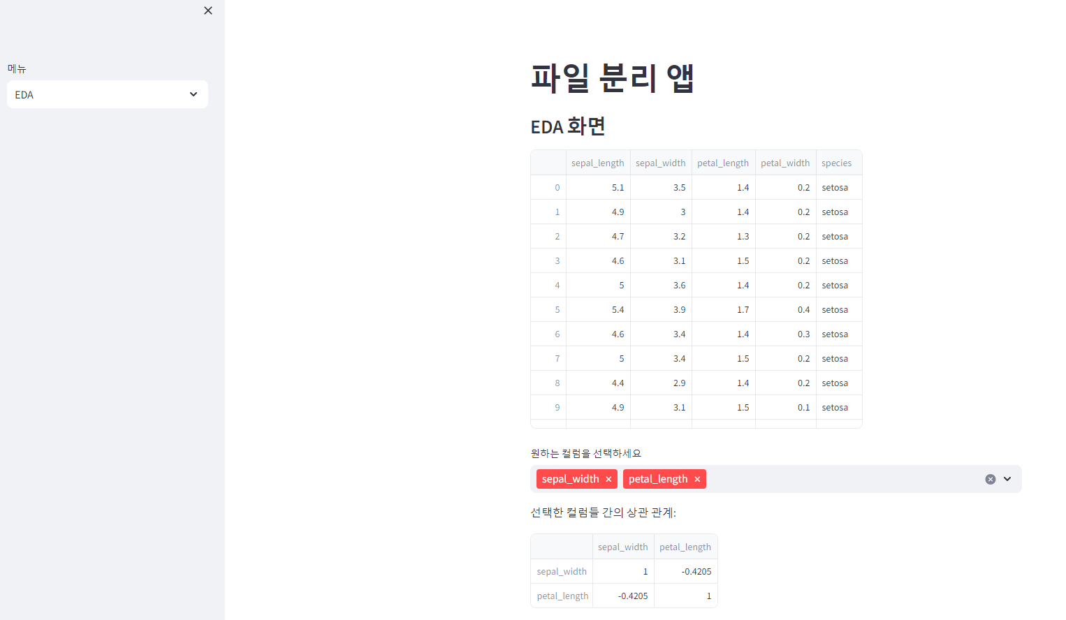 # iris.csv ํ์ผ์ ์ฝ์ด์์ ์ฌ๋ฌ ์ปฌ๋ผ๋ค ์ ํ ๊ฐ๋ฅํ ๋ก ํ์ฌ ์ ํํ ์ปฌ๋ผ๋ค๋ง ํ๋ฉด์ ๋ณด์ฌ์ฃผ๊ณ ์๊ด๊ณ์๋ ๋ณด์ฌ์ฃผ๋๋ก ๊ฐ๋ฐ