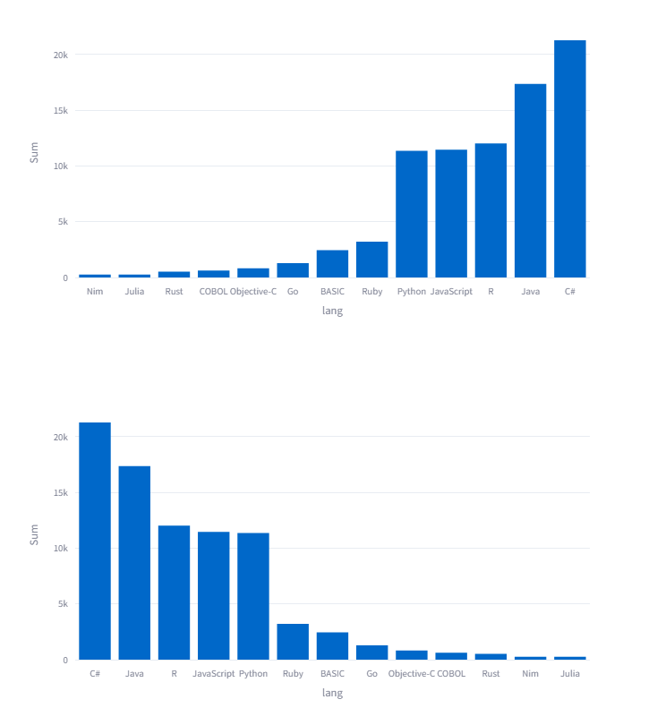 fig2 = px.bar(data_frame=df_sorted, x='lang', y='Sum')