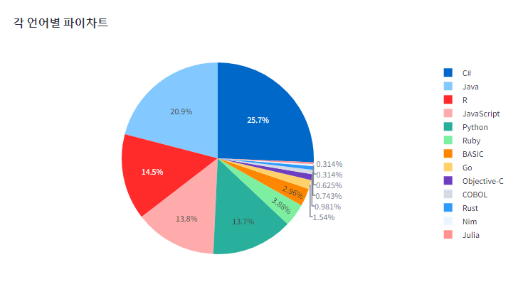 fig1 = px.pie(data_frame= df4, names='lang', values='Sum', title='각 언어별 파이차트')