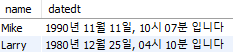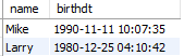 ( 'Mike', '1990-11-11', '10:07:35', '1990-11-11 10:07:35'),