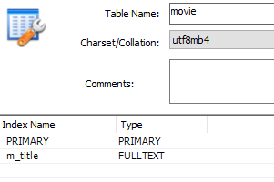 컬럼 설정에서 index에 index name을 자유롭게 지정하고, Type을 FULLTEXT로 하고,