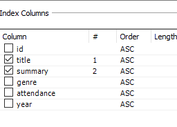 컬럼 설정에서 index에 index name을 자유롭게 지정하고, Type을 FULLTEXT로 하고,