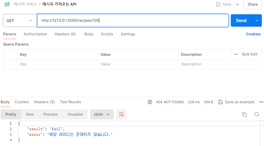 return {'result': 'fail', 'error': 'ํด๋น ์์ด๋๋ ์กด์ฌํ์ง ์์ต๋๋ค.'}, 404