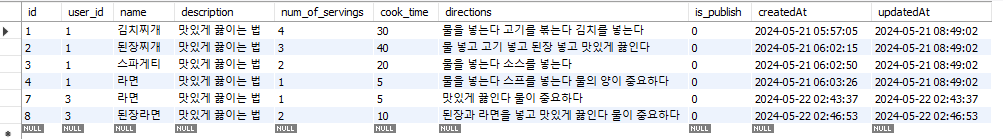 DB์ ๊ฐ๋ณด๋ฉด recipe_db์ recipe ํ ์ด๋ธ์ user_id๊ฐ 3์ผ๋ก ์ถ๊ฐ๋์๋ค.